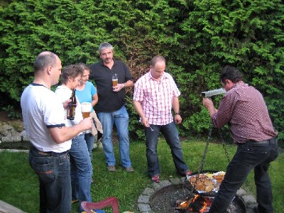Am Ausgangsort (Wiese hinterm Clubheim der Motorradfreunde) angekommen, warteten bereits die "Nichtwanderer" auf uns. Schnell wurden die kühlen Getränke geholt und der Grill (eigentlich zwei, aber was ist die Mehrzahl von Grill?) angeschmissen - denn nach dieser Anstrengung hatten wir großen Hunger und noch mehr Durst. Nach dem Mahl zauberte so mancher noch ein leckeres "Verreisserle" hervor - mir persönlich schmeckte der "Schlehenlikör" am besten (anderen auch, Anm. der Redaktion).